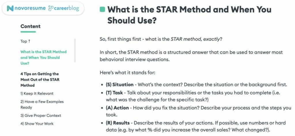 The STAR method works well for any interview question that involves telling a story, for example – “tell me about a time when you…” The key components are below, but Novoresume’s site does a great job of explaining it in depth.